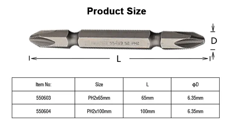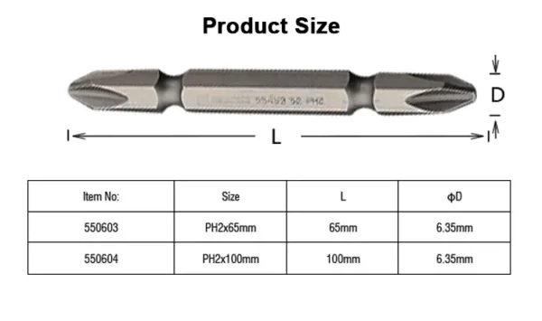 Each screwdriver bit in this set is PH2 x 65mm, the most versatile size for household, automotive, and industrial applications. The 6.35mm (1/4-inch) hex shank ensures a perfect fit with all standard electric screwdrivers, drills, and manual tools, offering tight grip stability and smooth torque transfer. With flawless design and consistent dimensions, these bits guarantee seamless engagement with screw heads—preventing slippage and protecting both the screw and your tool.