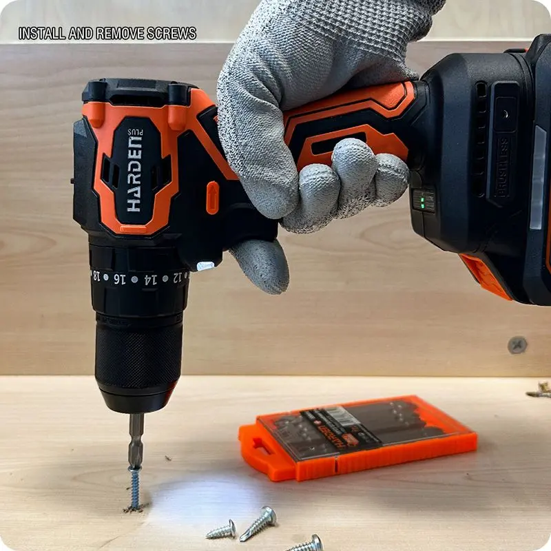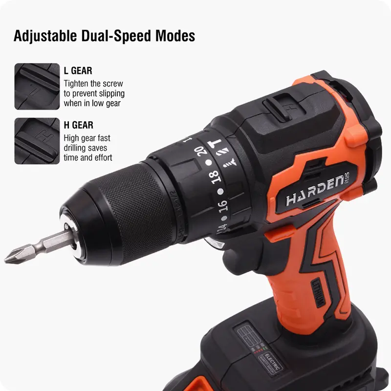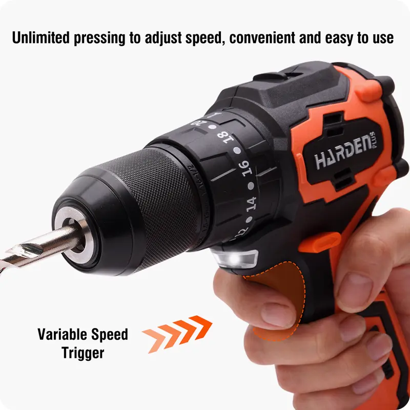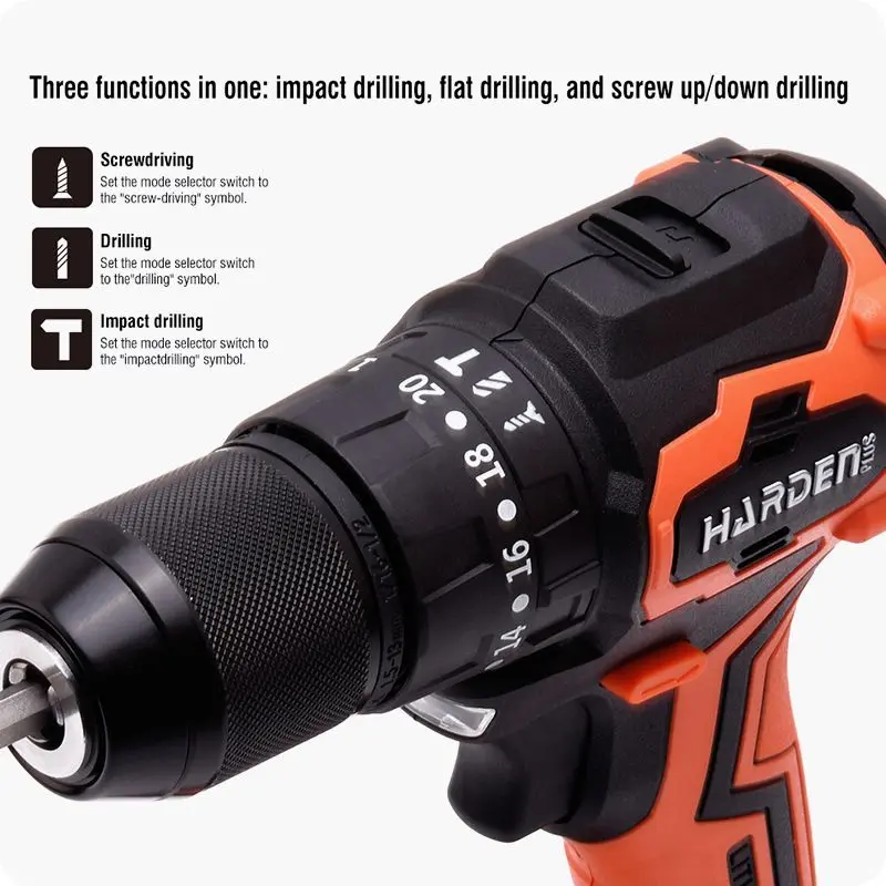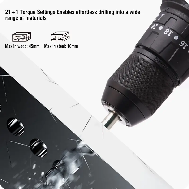 Switch seamlessly between impact drilling, flat drilling, and screwdriving with the easy mode-selector system. From drilling 45mm holes in wood to penetrating 10mm steel, the 21+1 torque settings ensure precision across various materials. The dual-speed modes (0–500 / 0–2000 RPM) allow optimized control—low gear for safe screw tightening and high gear for fast drilling. A smooth variable-speed trigger lets you adjust output with accuracy.