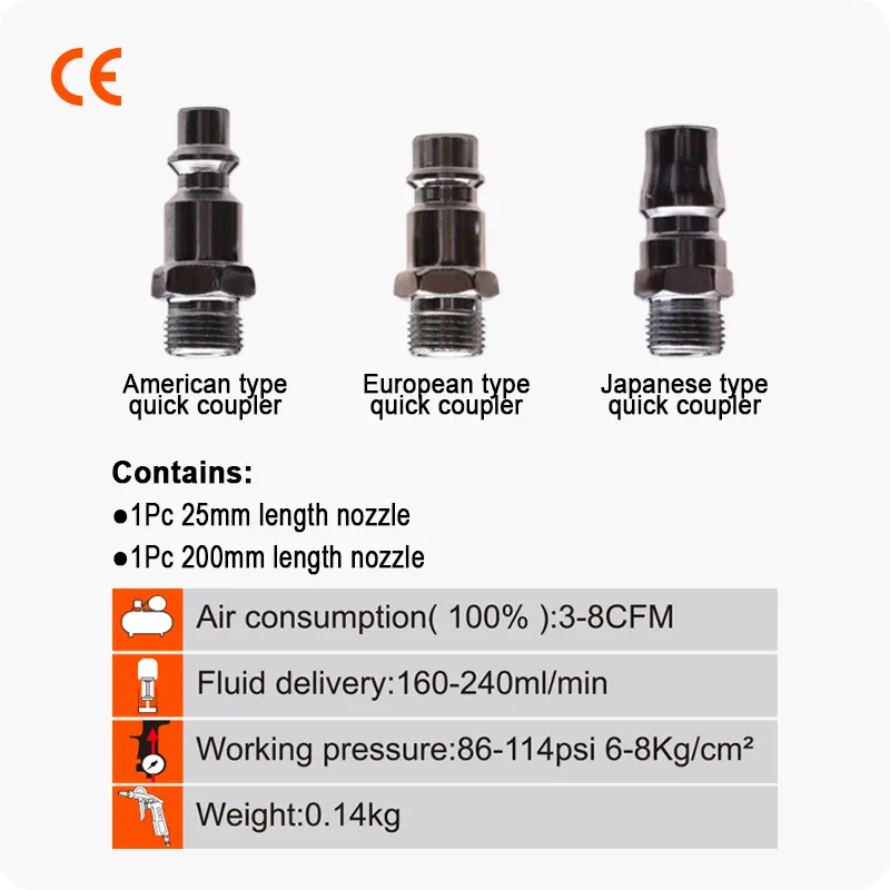 This set includes two nozzles—a 25 mm nozzle and a 200 mm nozzle—giving you full control for targeted or extended reach cleaning. Designed for compatibility with HARDEN’s 10-meter Air Hose and equipped with an American-type quick coupler, the blow gun set ensures a secure connection and smooth airflow. Whether you’re cleaning tight spaces, delicate circuit boards, or large equipment, these nozzles provide total versatility and convenience.
