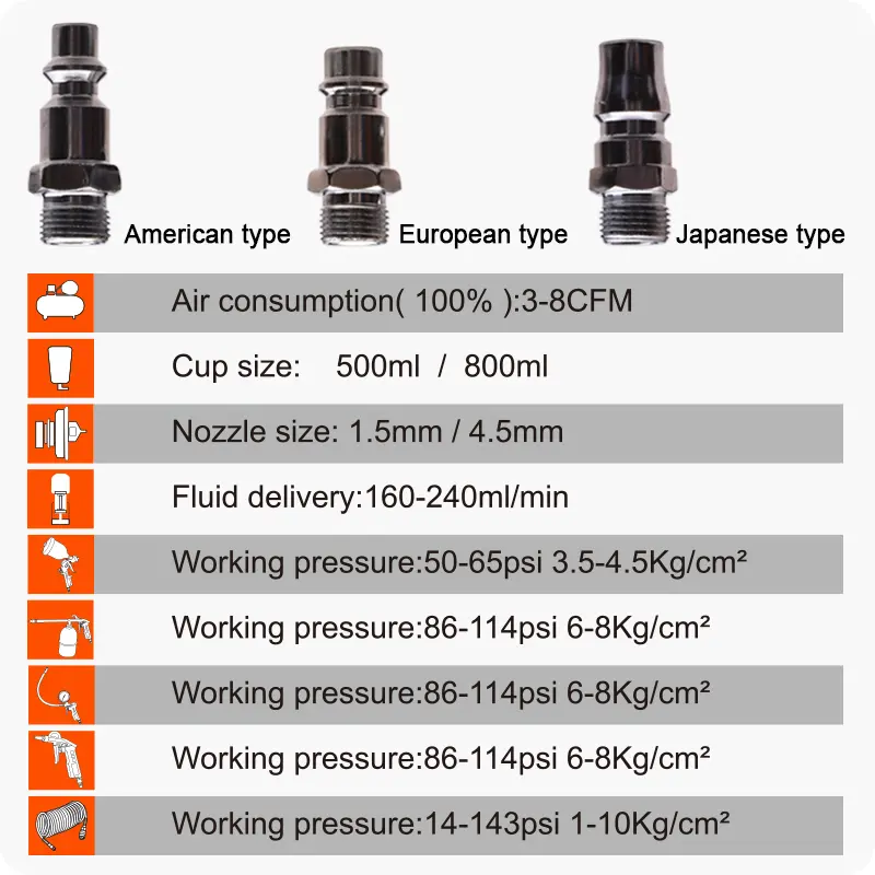 A 5-meter spiral air hose with an American-type quick coupler ensures easy connectivity and efficient airflow. The set is also compatible with European and Japanese-type connectors, making it suitable for various compressor systems used across workshops and service centers.