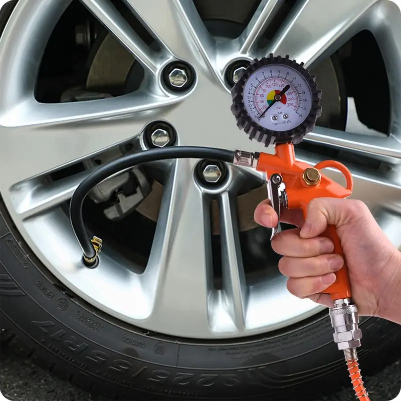 The kit also features a tire pressure gauge with a measurement range of 0–16 bar / 0–220 psi, ensuring accuracy in automotive tire servicing. A durable air blow gun is included for removing dust, swarf, and debris from machinery, work surfaces, and hard-to-reach areas, supporting both industrial and household cleaning needs.