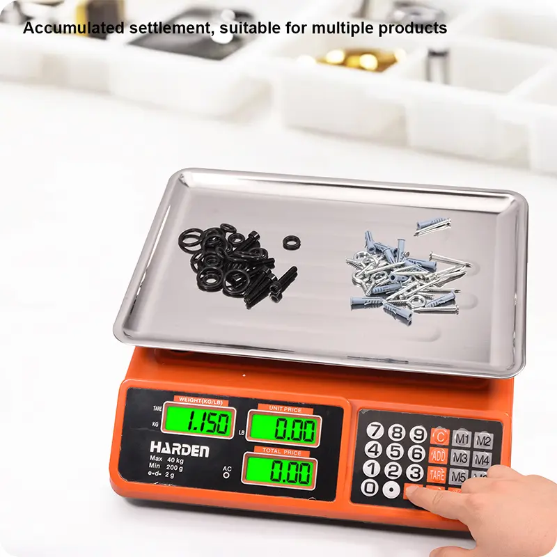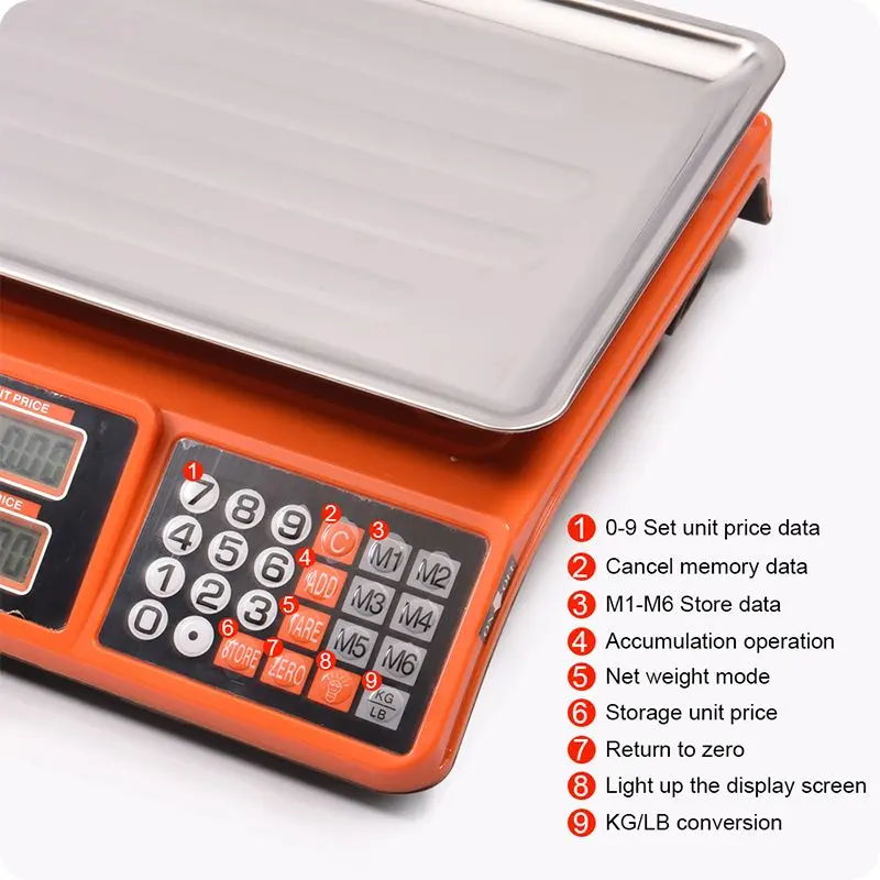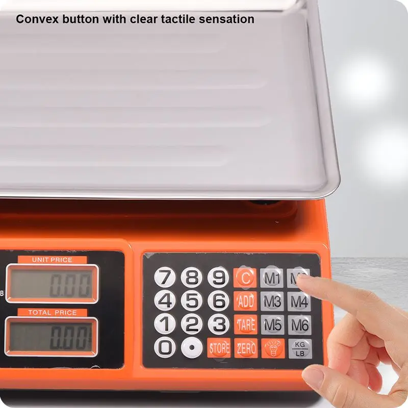 Engineered for performance and durability, this electronic scale features a 410 stainless steel weighing disc that resists oil stains and wipes clean instantly. The stainless steel table (340 × 240mm) provides a stable weighing surface for various products. With accumulated settlement, memory storage (M1–M6), and unit price input (0–9 buttons), it streamlines multi-item transactions and improves checkout speed. The KG/LB conversion button enables effortless switching between measurement units, catering to the diverse needs of customers.