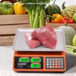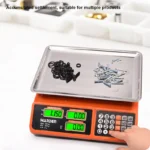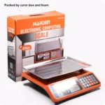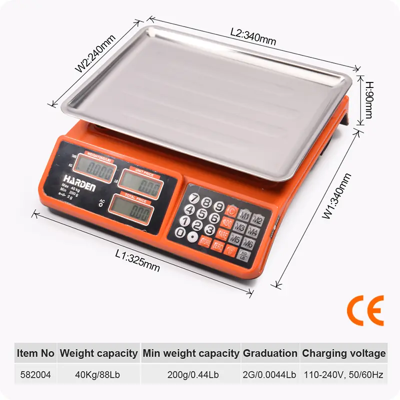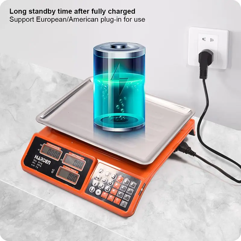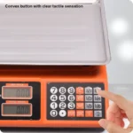 Accurate 40kg electronic price computing scale with dual LED display, rechargeable battery, KG/LB conversion, and CE approval. Available at Damam Hardware, UAE.