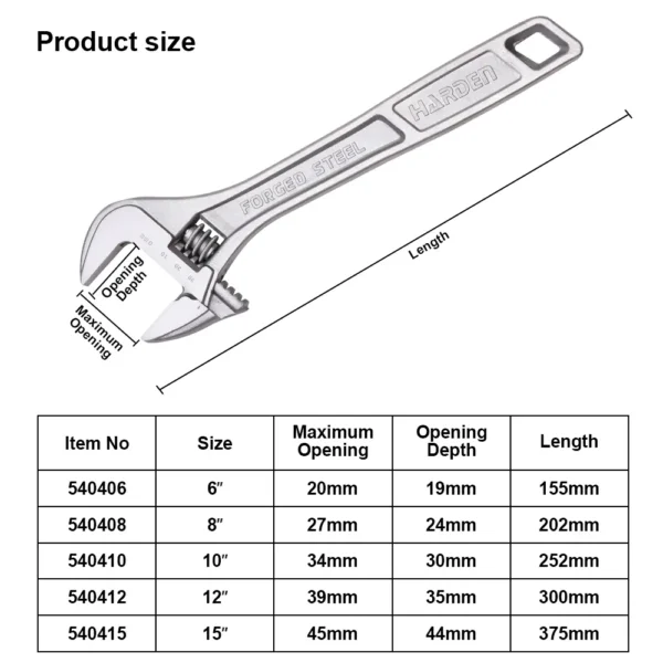 The Harden Adjustable Wrench is forged from high-quality medium carbon steel, ensuring exceptional strength and durability for professional and home use. Its heat-treated body provides superior resistance to bending or breaking, making it ideal for demanding applications in automotive, plumbing, construction, and mechanical work. Whether tightening bolts or loosening stubborn nuts, this wrench delivers consistent power and reliability you can trust.