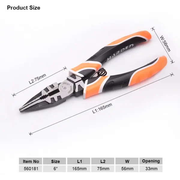 At just 6 inches (165mm) in length, this plier offers high leverage power in a compact form. Its slim, long-nose design allows you to reach confined areas easily — perfect for electrical, mechanical, and crafting applications. With jaw widths of 18.6mm and 56mm, it’s versatile enough for gripping small components and bending wires with precision.